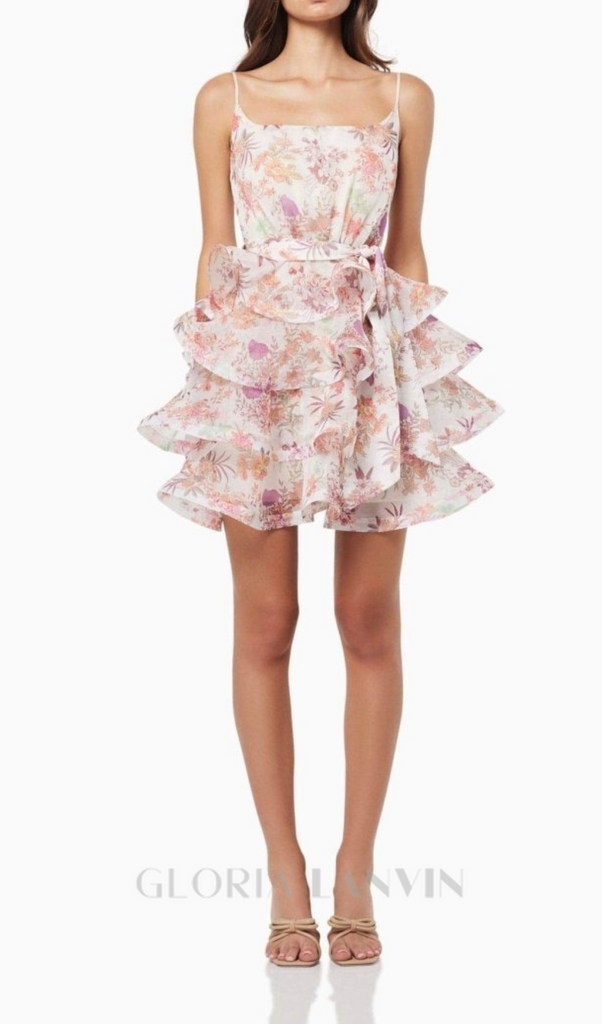 AMANDA MINIKLEID MIT MEHRFARBIGEM BLUMENDRUCK UND RÜSCHEN