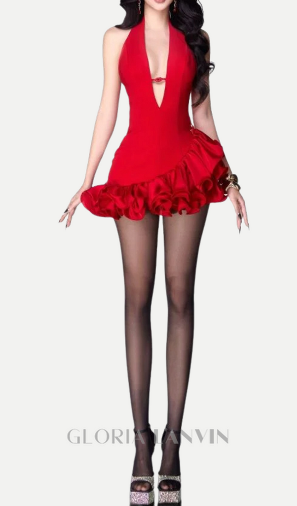 rotes Minikleid mit V-Ausschnitt und Rüschenbesatz