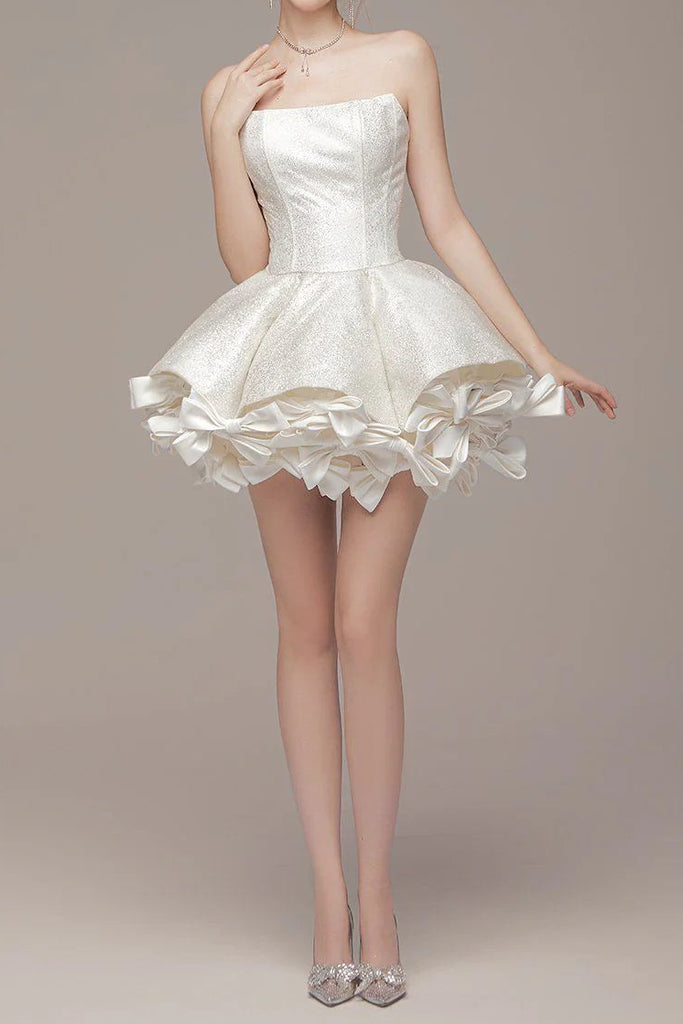 Weißes, trägerloses Minikleid mit Schleifenbesatz