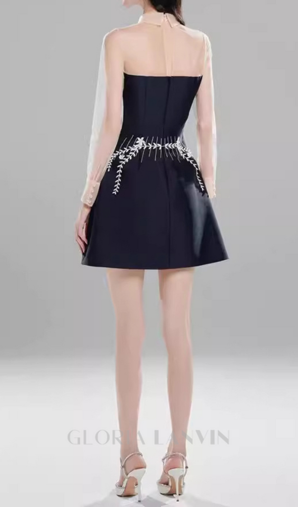 Dieses dunkelblaue, bestickte Minikleid aus Tüll mit Blumenapplikationen am Revers ist ein Must-have für alle, die einen einzigartigen und eleganten Look suchen. Die filigranen Blumenapplikationen verleihen ihm eine feminine Note, während der Tüllstoff eine zarte und luftige Silhouette zaubert. Mit diesem wunderschönen Kleid setzen Sie ein modisches Statement.