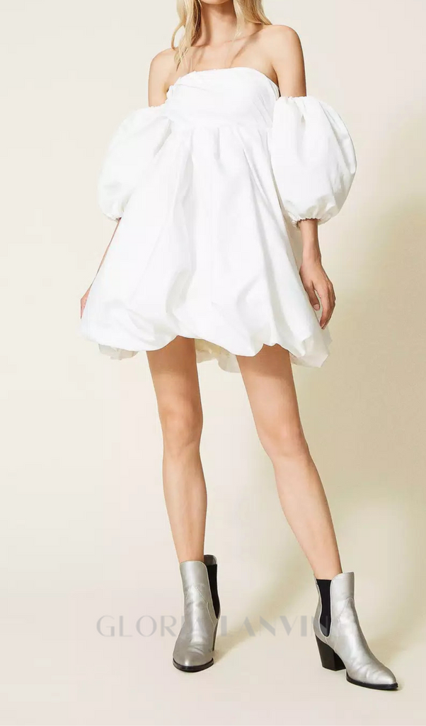 Dieses aus luxuriösem Duchesse-Stoff gefertigte Minikleid besticht durch elegante Puffärmel und einen zeitlosen weißen Farbton. Die strukturierte Silhouette und die einzigartigen Ärmel sorgen für eine schmeichelhafte Passform und verleihen dem Kleid gleichzeitig einen Hauch von Eleganz. Bereichern Sie Ihre Garderobe mit diesem vielseitigen und stilvollen Kleidungsstück.