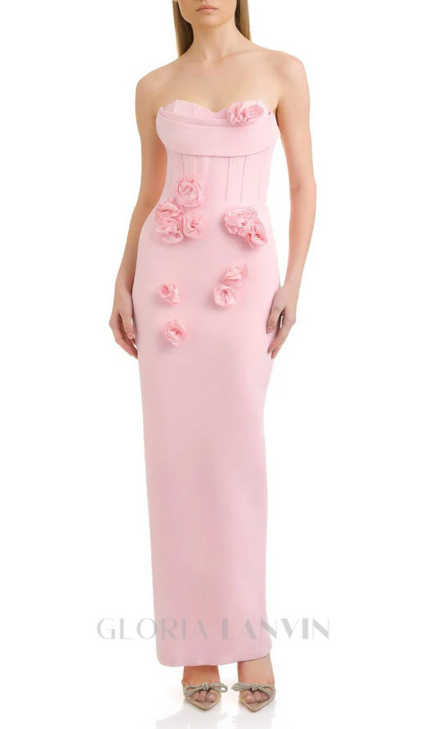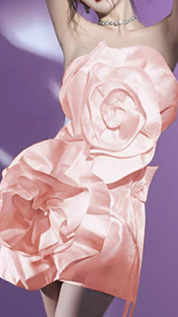 TRÄGERLOSES MINIKLEID MIT 3D-BLUMENMODUS IN PINK