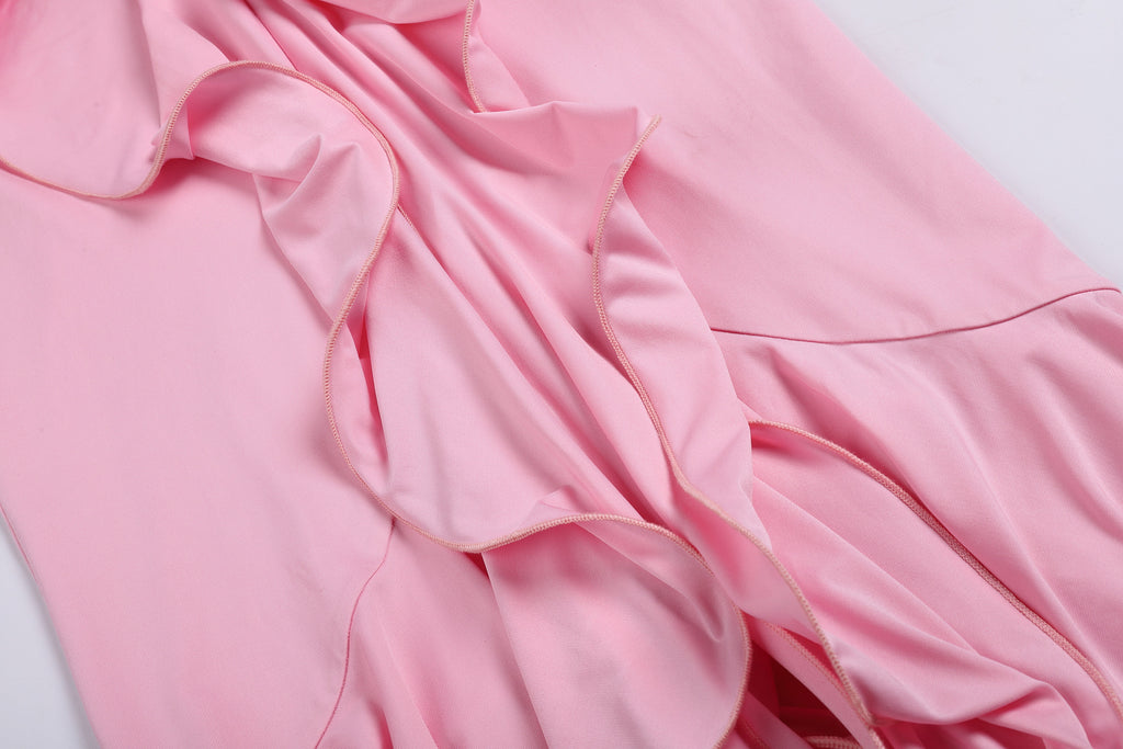 MAXIKLEID MIT TIEFEN V-AUSSCHNITT, RÜSCHEN UND BLUMENVERZIERUNG