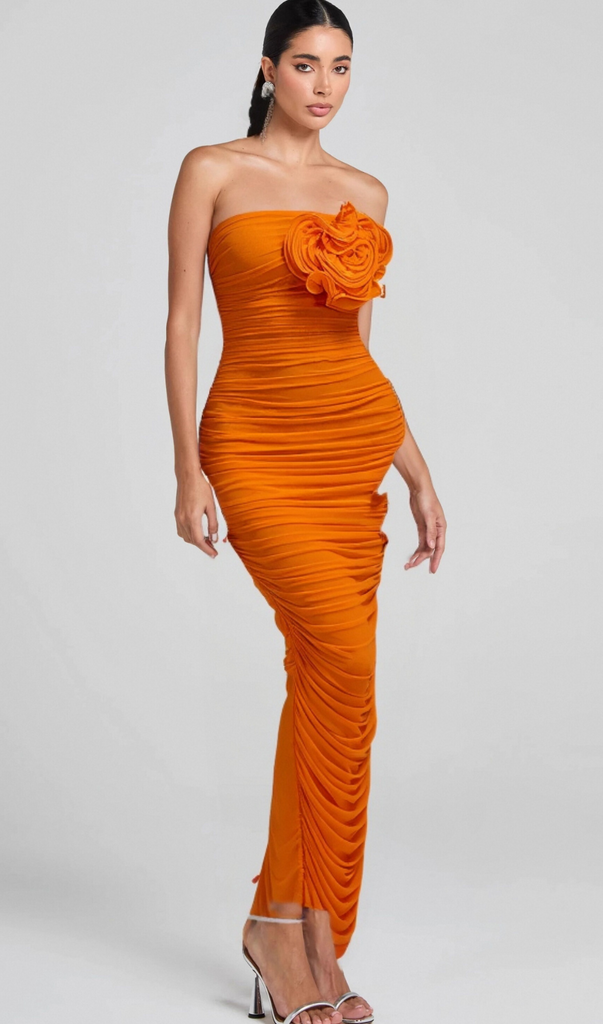 Orangefarbenes, rückenfreies, gerafftes Maxikleid mit Blumenmuster