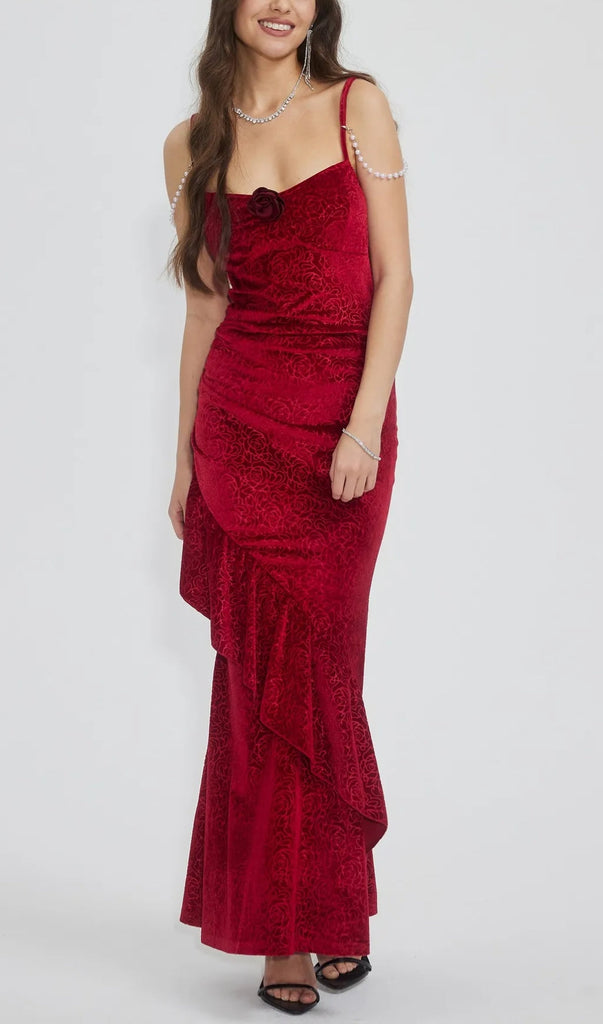 BODYCON-MAXIKLEID MIT RÜSCHEN UND HOSENTRÄGERN IN ROT