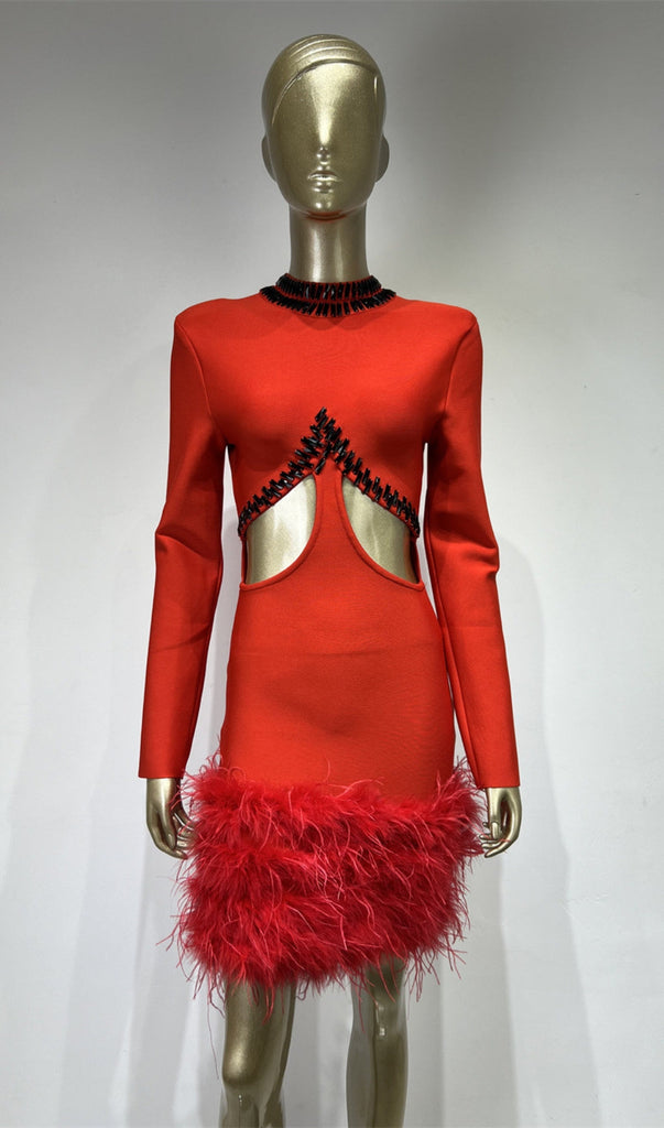 Dieses elegante Bandagekleid mit Strass-Ausschnitten und Federn besticht durch ein atemberaubendes Strass-Design, auffällige Ausschnitte und luxuriöse Federakzente. Es ist aus einem figurbetonten Bandage-Material gefertigt und schmeichelt und betont Ihre Kurven. Dieses rote Kleid ist perfekt für besondere Anlässe und lässt Sie auffallen und Ihnen Selbstvertrauen geben.