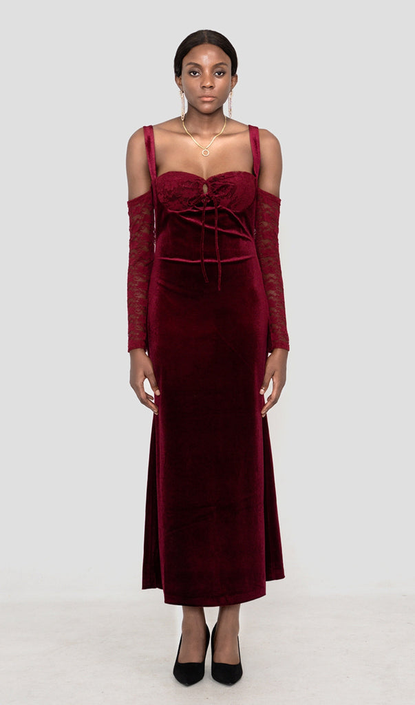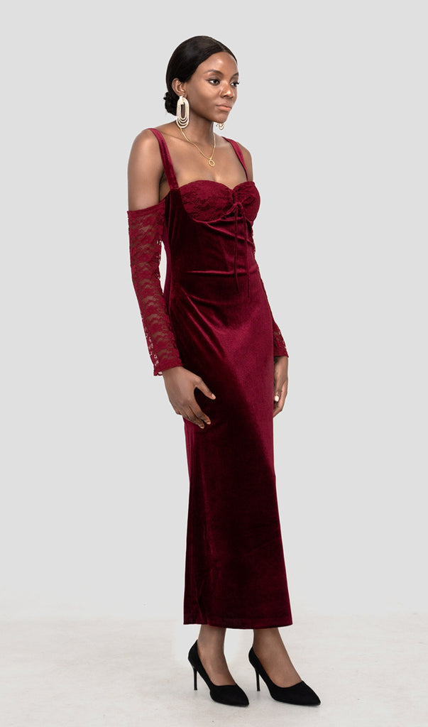 Unser SAMT-MAXIKLEID strahlt Drama und Glamour aus. Es ist aus herrlich weichem Stretch-Samt in einem Schwarzkirschton gefertigt und schmiegt sich an die Figur, um Ihre Kurven zu betonen. Die hübschen Spitzen-Cups sind mit Bügeln versehen, die für schmeichelnden Halt sorgen, und die zarten Spitzenärmel sorgen für elegante Dramatik.