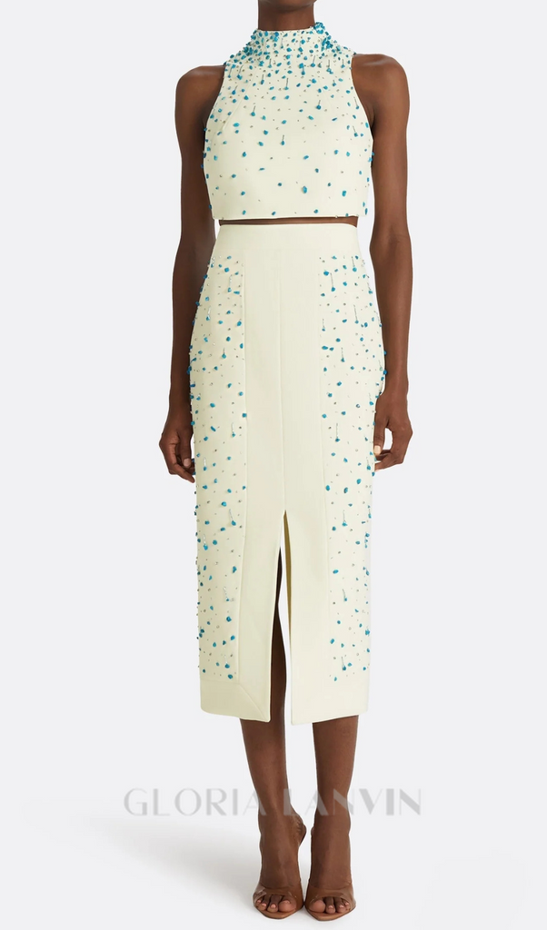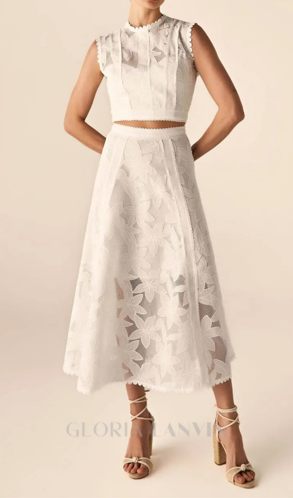 Guipure-Mesh-Midirock-Crop-Top-Set in Weiß