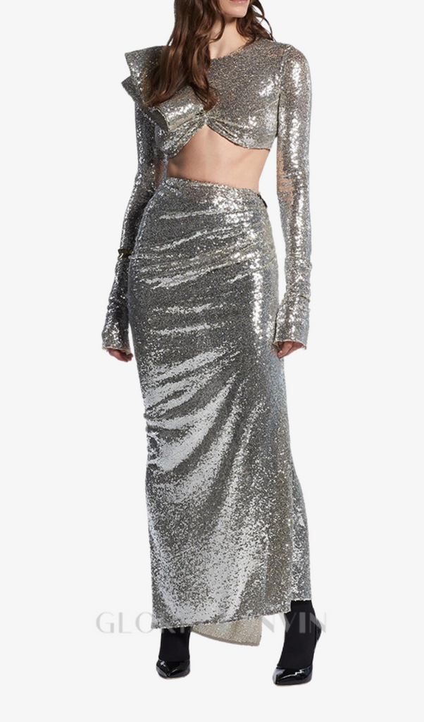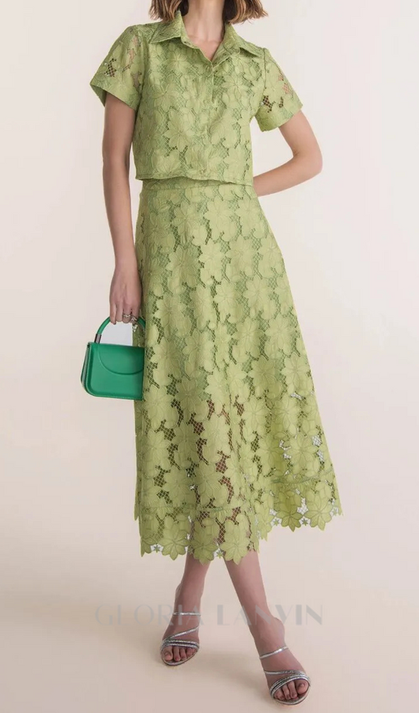 Grünes Set aus Guipure-Mesh-Midirock und kurzem Oberteil