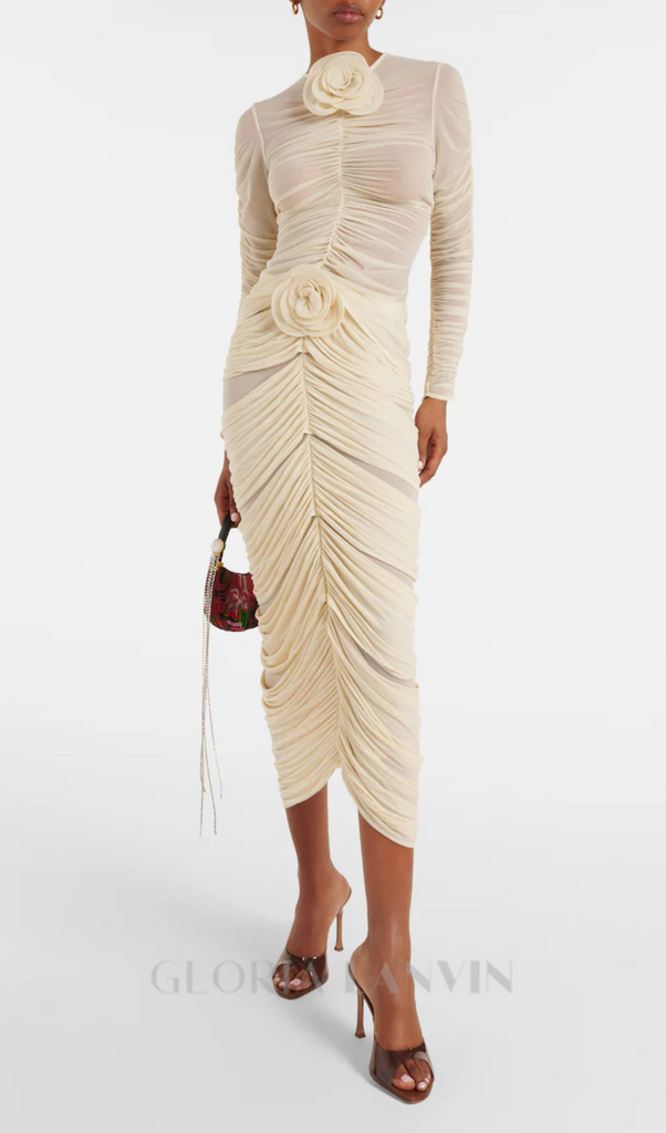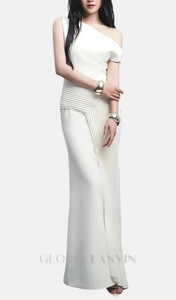 Elfenbeinfarbenes, gerafftes, asymmetrisches Maxikleid