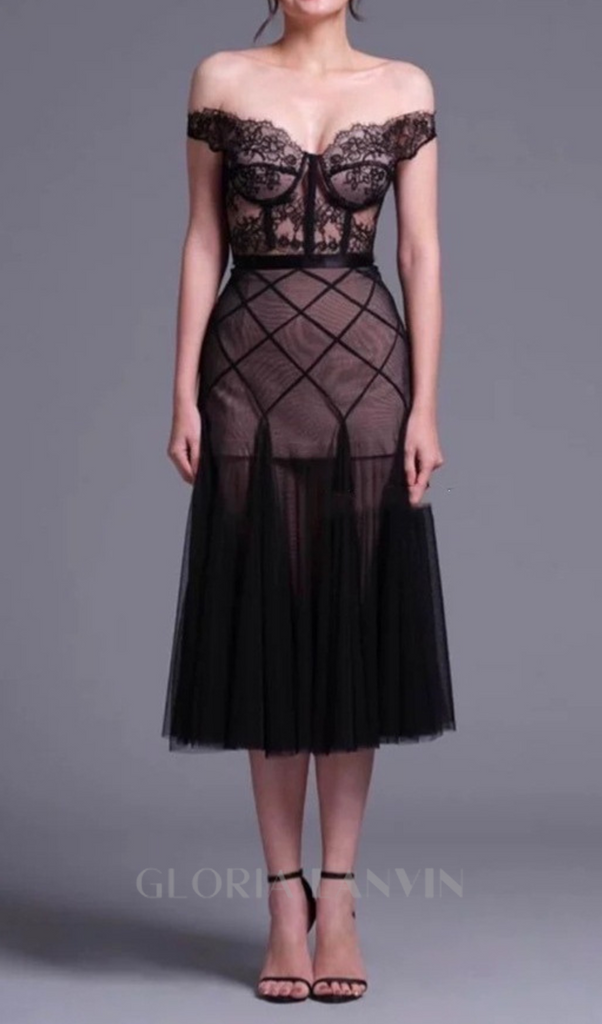 Set aus floralem Dentelle-Bustier mit schulterfreiem Korsett und Netzrock