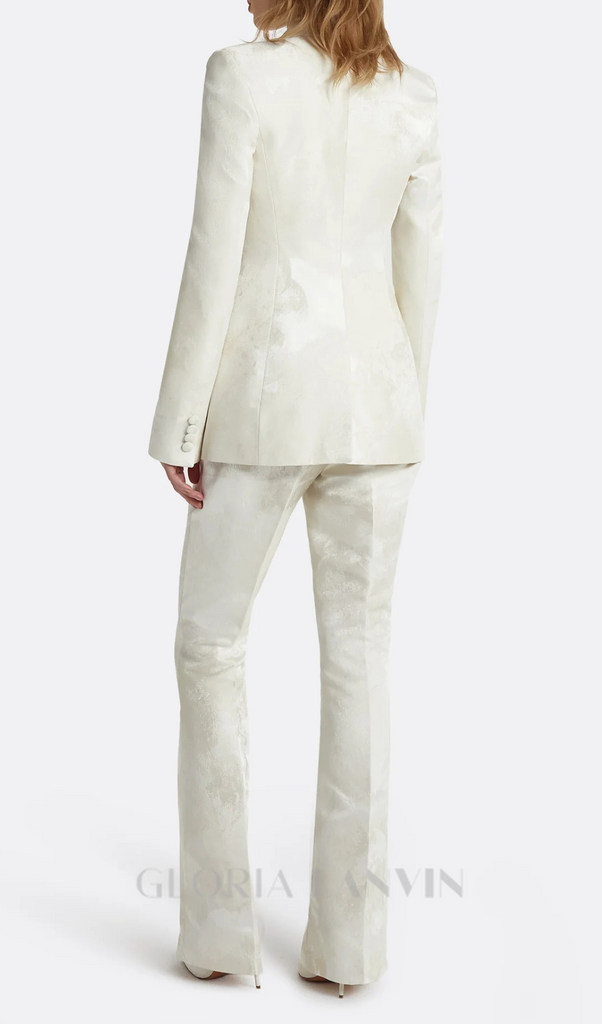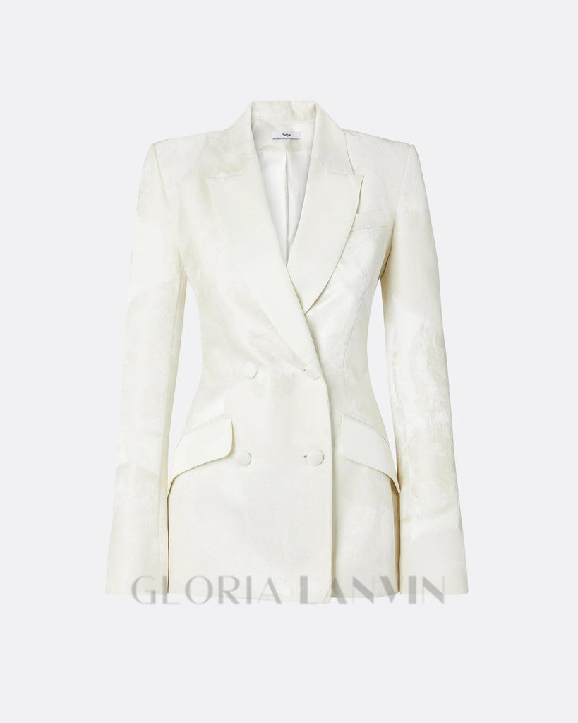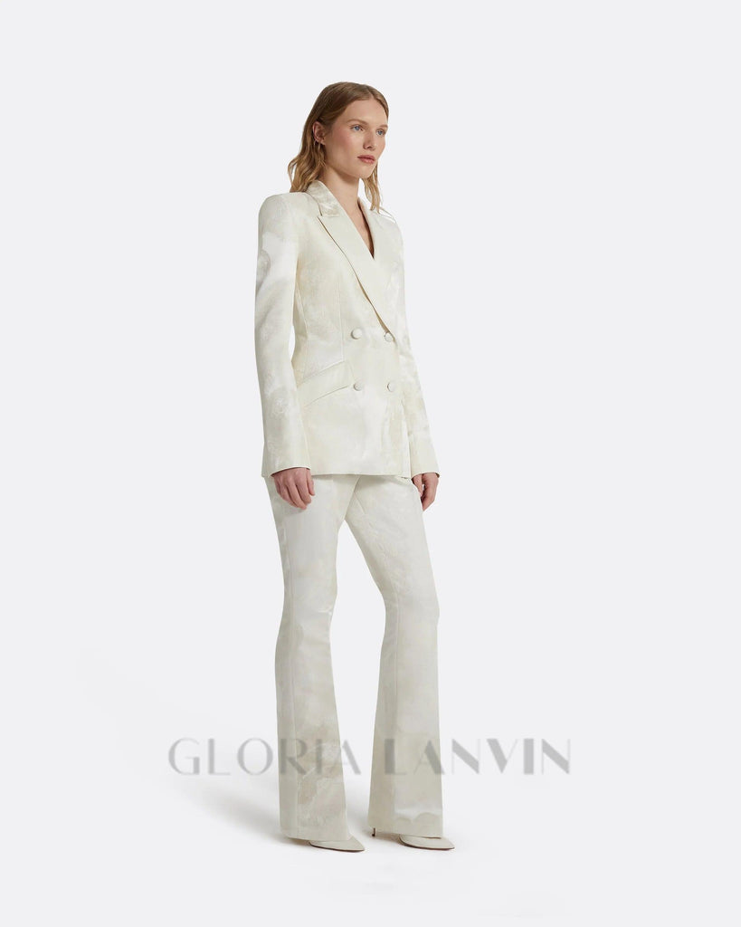 Dieser elfenbeinfarbene, doppelreihige Blazeranzug aus Jacquard-Stoff ist eine stilvolle und elegante Ergänzung für jede Garderobe. Der strukturierte Jacquard-Stoff verleiht ihm einen Hauch von Luxus, während das doppelreihige Design Eleganz ausstrahlt. Perfekt für formelle Anlässe oder um Ihrem Alltagslook einen Hauch von Raffinesse zu verleihen.