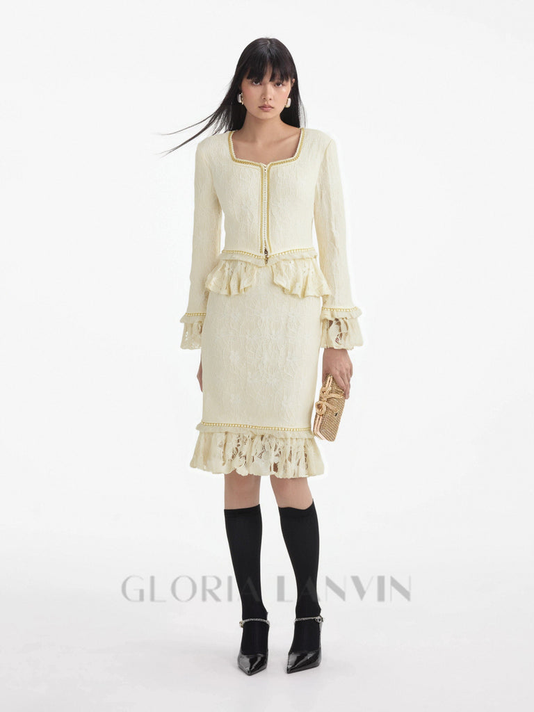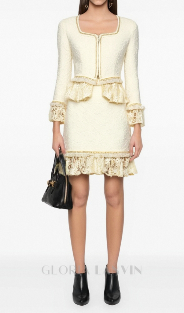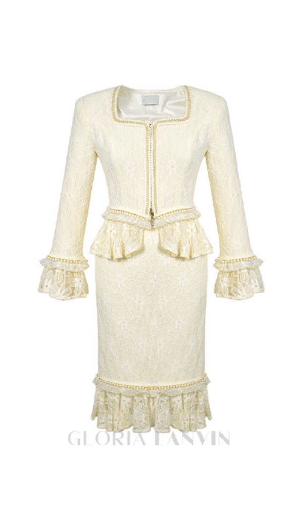 Dieser trendige und zugleich elegante Bodycon-Rockanzug mit Spitzenoberteil ist perfekt für jeden festlichen Anlass. Der elfenbeinfarbene Ton verleiht ihm eine klassische Note, während die figurbetonte Passform Ihre Kurven vorteilhaft betont. Gefertigt aus hochwertiger Spitze, ist dieser Anzug sowohl bequem als auch stilvoll.