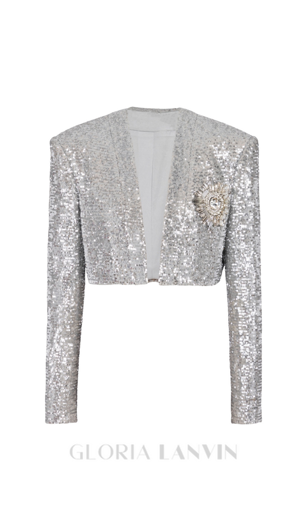 Bereichern Sie Ihre Garderobe mit unserem luxuriösen Pailletten-Blazer. Das aufwendige Paillettenmuster verleiht ihm einen Hauch von Extravaganz, während der kurze Schnitt für einen modernen und trendigen Look sorgt. Perfekt für besondere Anlässe oder um Ihren Alltagslook aufzuwerten.