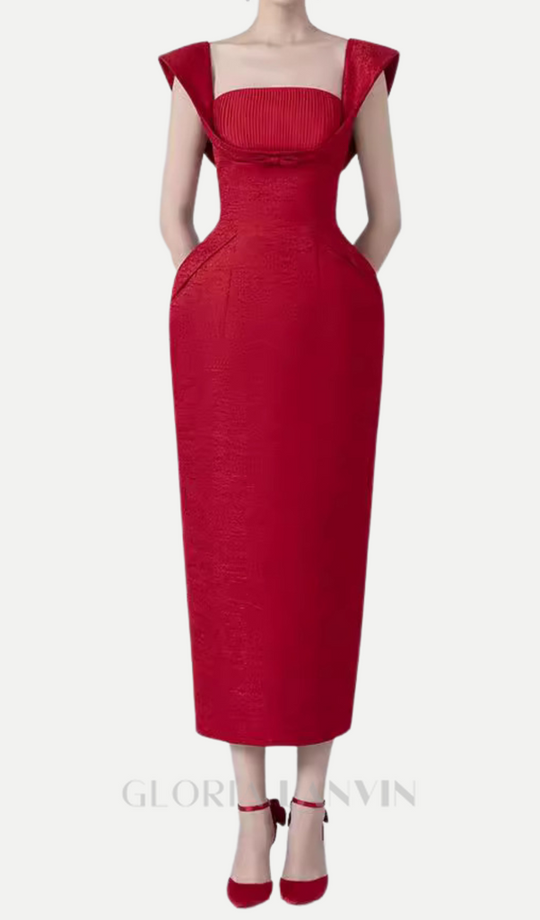 Rotes Midikleid mit eckigem Ausschnitt und Schleife