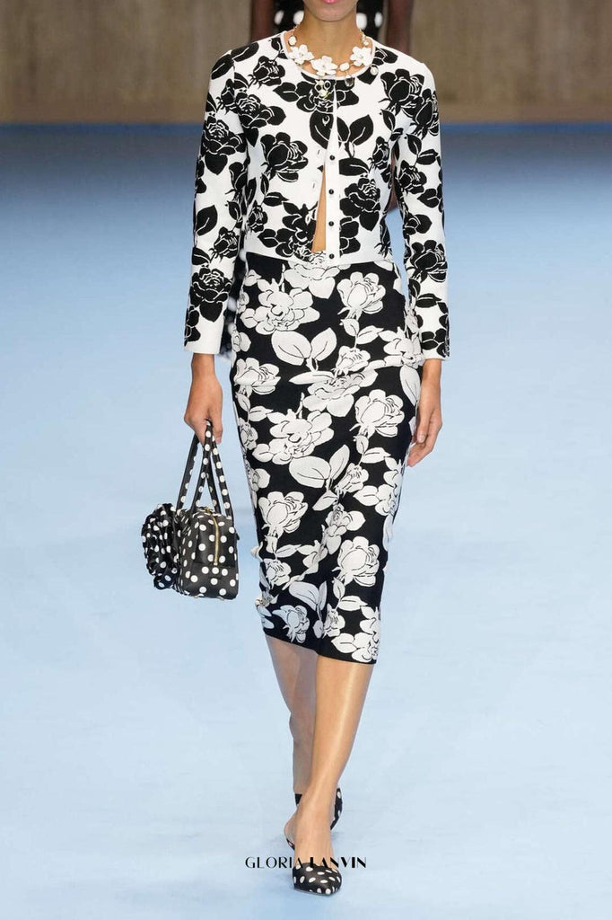 Strickset aus floralem Jacquard-Strickjacke und Bleistiftrock in Midi-Länge