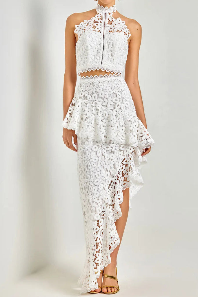 Ärmelloses Spitzenoberteil mit asymmetrischem Rock, weiß