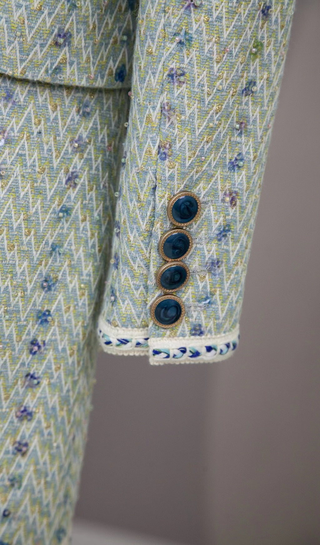 FLORALE TWEED-KNÖPFE-JACKE + MINIROCK