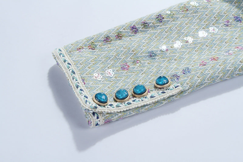 Dieses Set ist ein wahrgewordener Traum für Fashionistas! Mit einer Jacke und einem Rock im Small Fragrant Style mit schwerer Paillettenstickerei setzen Sie überall ein Statement. Mit umwerfendem Stil und unerwartetem Flair ist dieses Set ein Muss für jede Garderobe. Machen Sie sich bereit zu funkeln!