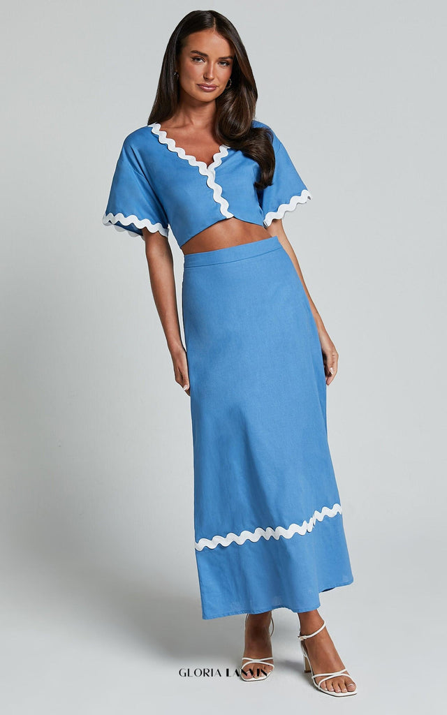 Bereit für einen umwerfenden Auftritt? Dann ist unser Blythe-Set genau das Richtige! Dieses partytaugliche A-Linien-Set besticht durch einen wunderschönen Wellensaum, der der klassischen Silhouette eine verspielte Note verleiht. Gefertigt aus einer Baumwoll-Viskose-Mischung, ist dieses Set nicht nur bequem, sondern fühlt sich auch luxuriös an. Der V-Ausschnitt und die kurzen Ärmel schmeicheln jeder Figur und machen es zur perfekten Wahl für jede Party – ob tagsüber oder abends. Egal ob sommerliches Open-Air-Event oder festlicher Abend: In diesem blauen Midikleid sehen Sie mühelos schick und einfach fabelhaft aus!