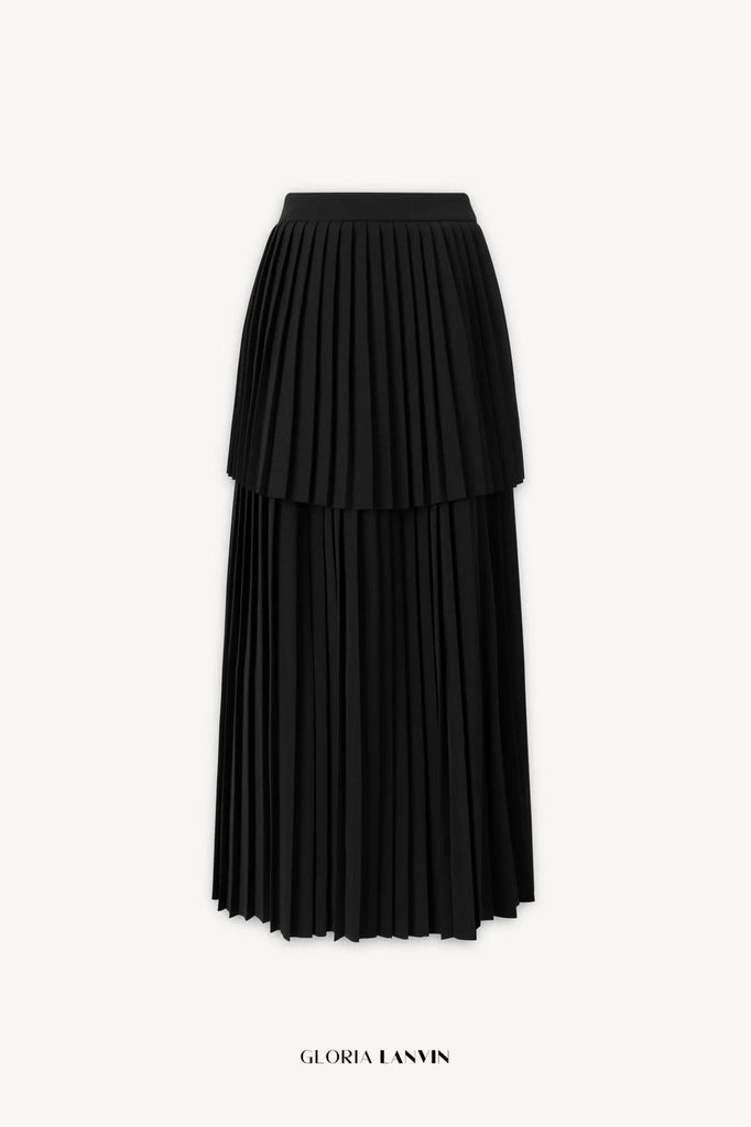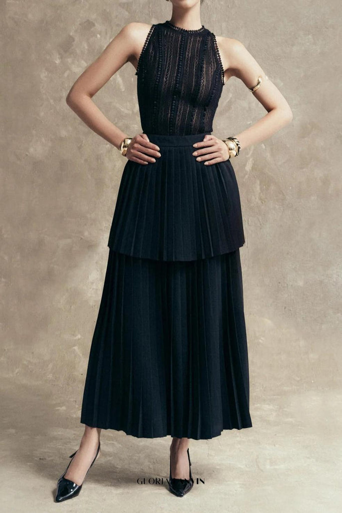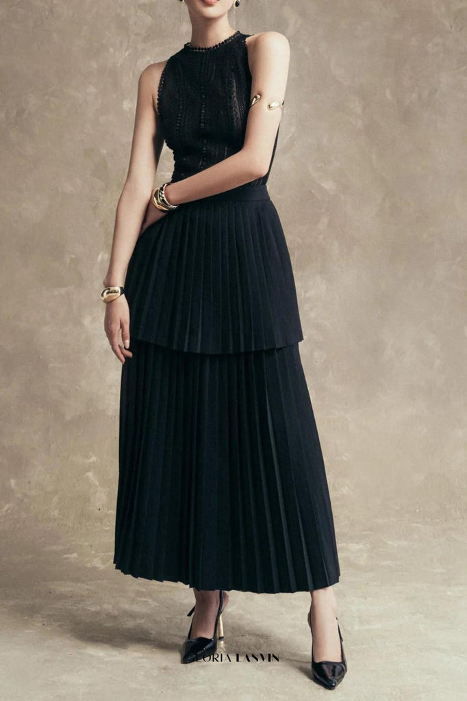 Dieser ärmellose, plissierte Lagenrock in Schwarz vereint raffinierte Schneiderkunst mit elegantem Design. Die plissierten Lagen verleihen dem Rock Struktur und Dynamik, während der ärmellose Schnitt eine moderne, vielseitige Silhouette schafft. Perfekt für den Berufsalltag oder festliche Anlässe – dieser Rock bietet Stil und Komfort mit einem eleganten, edlen Finish.