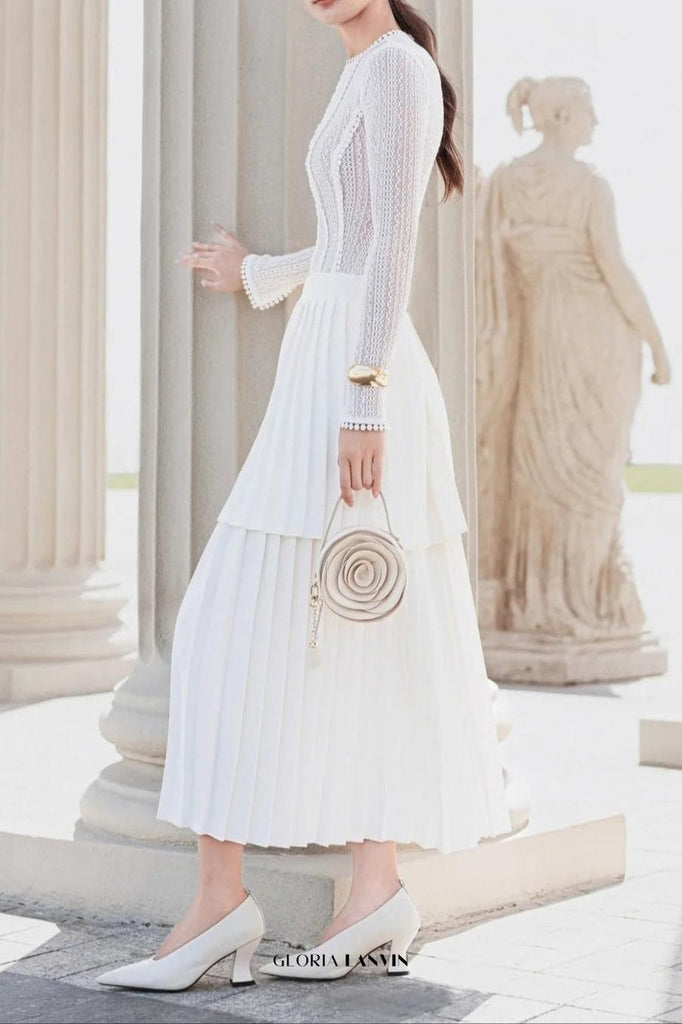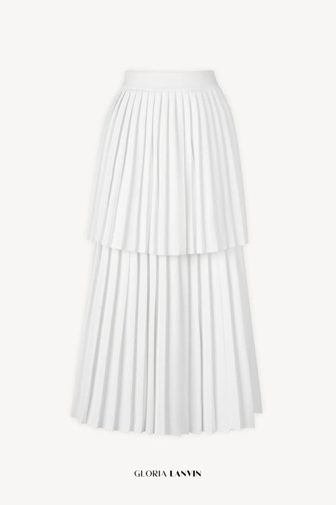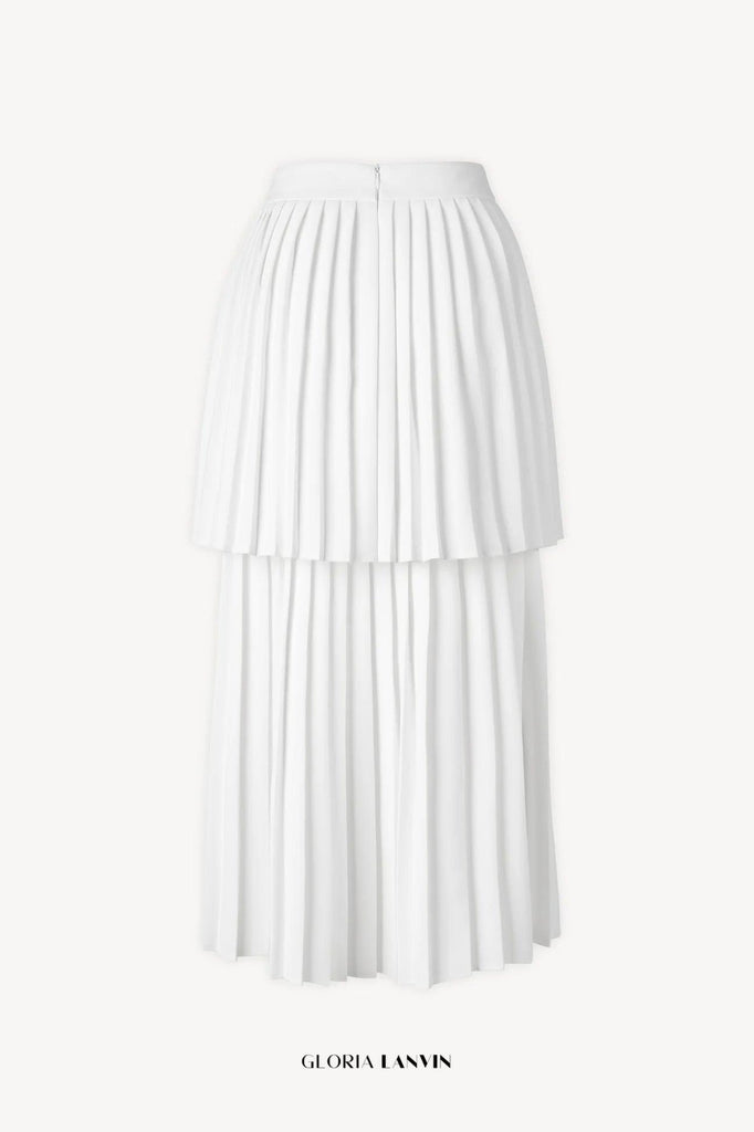 Dieser ärmellose, plissierte Lagenrock in Weiß vereint raffinierte Schnittführung mit elegantem Design. Die plissierten Lagen verleihen dem Rock Struktur und Schwung und kreieren eine raffinierte Silhouette, die sich ideal für professionelle oder formelle Anlässe eignet. Der Rock ist so gefertigt, dass er sowohl Stil als auch Komfort bietet und Ihre Garderobe um ein zeitloses, vielseitiges Kleidungsstück bereichert.