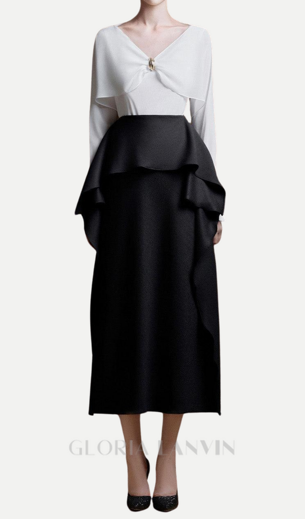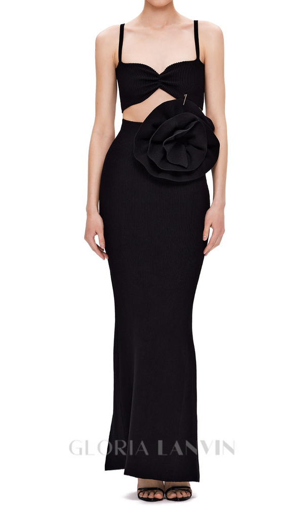 SCHWARZER STRICKANZUG MIT GESTREIFTEM TOP UND ROCK MIT BLÜTENSCHNITT