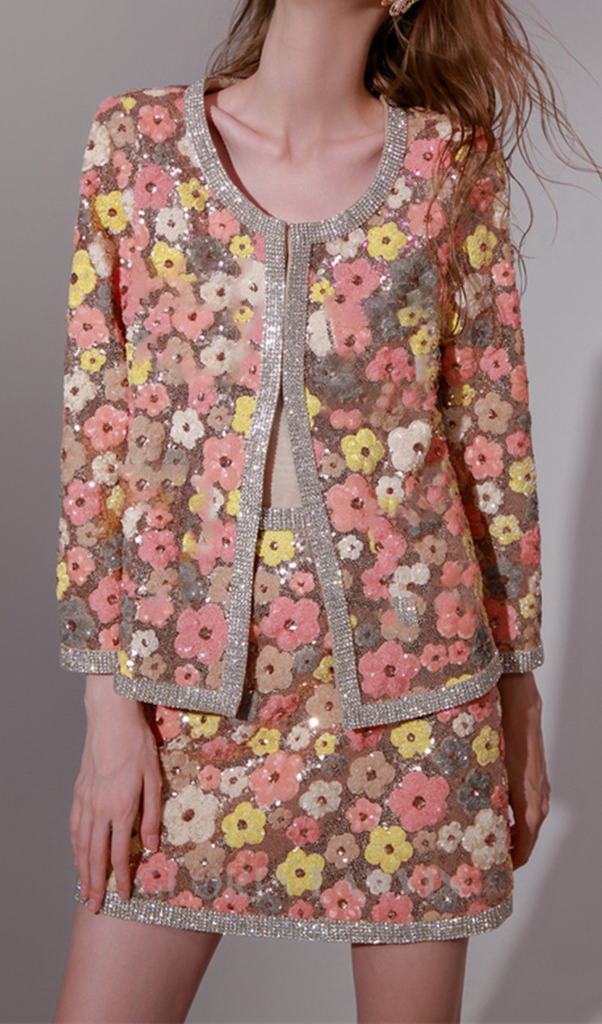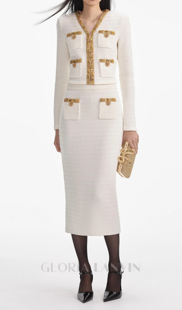 Beigefarbener Rockblazer mit Perlen- und Diamantverzierungen