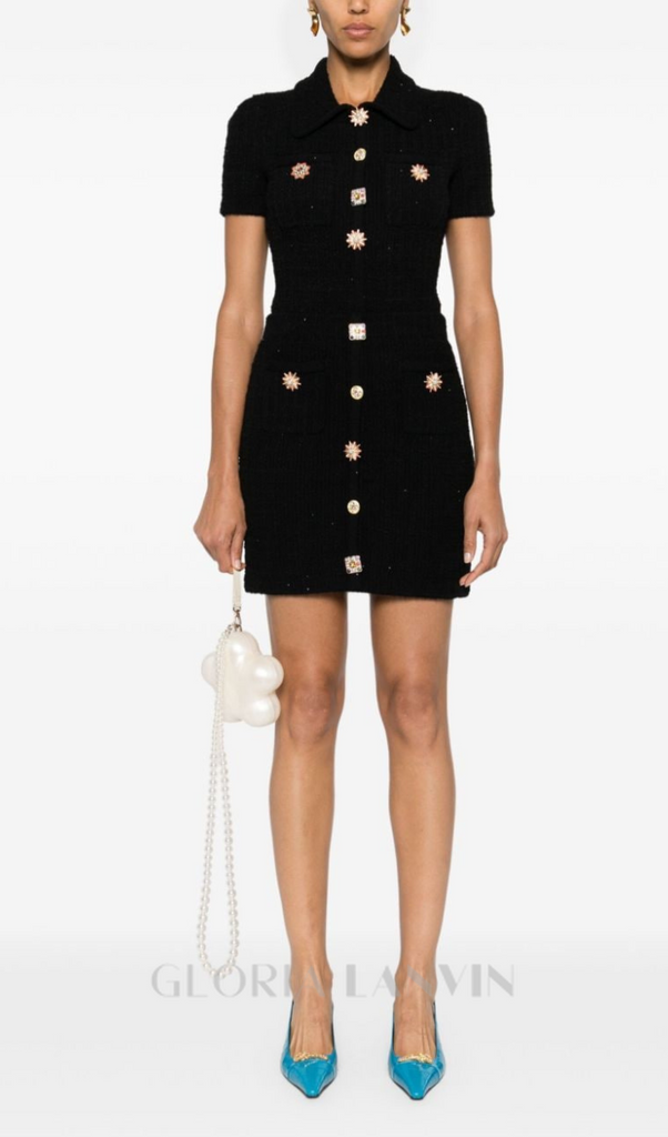 Schwarzes Cordelia-Midikleid mit Diamantenbesatz