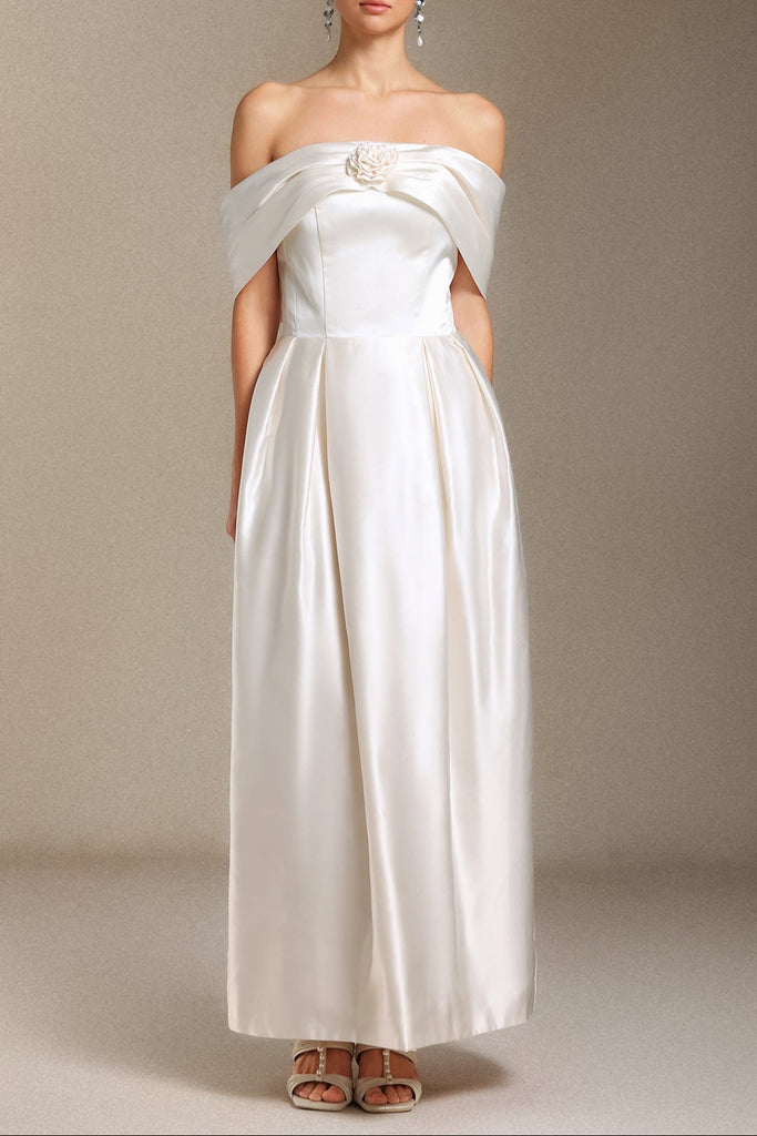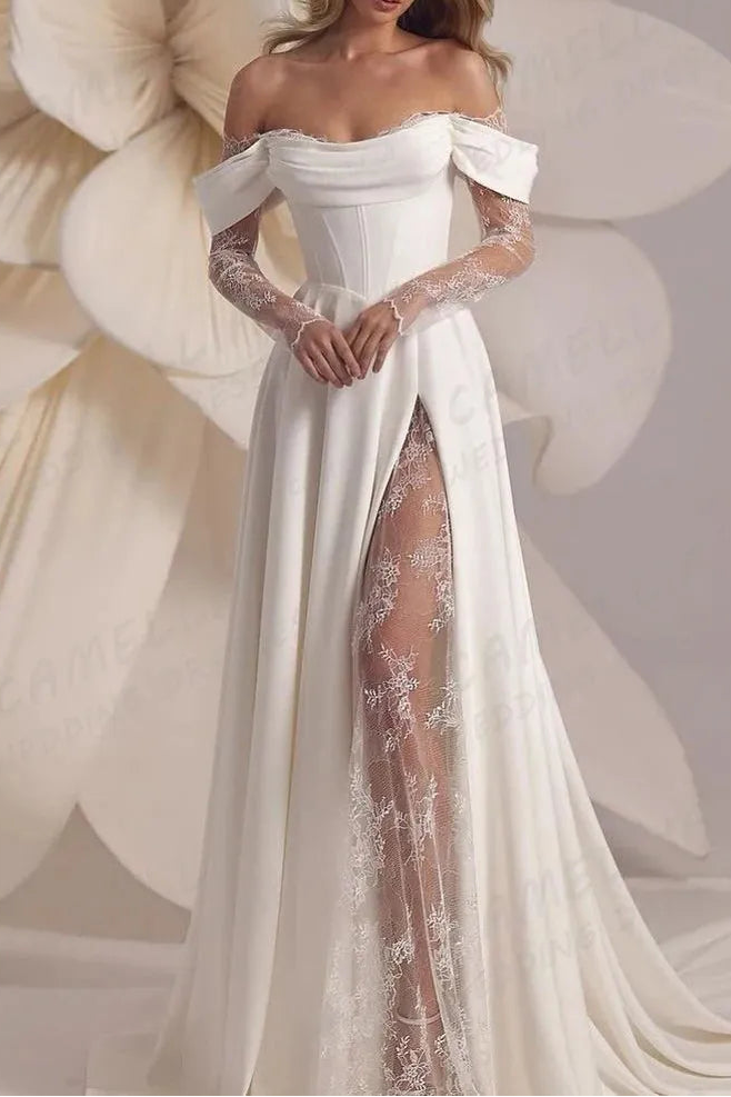 Brautkleider in A-Linie mit schulterfreiem Schnitt, Satin und Spitzenapplikationen