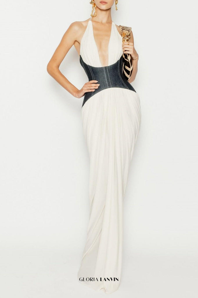Samt-Maxikleid mit Bustier in Schwarz und Weiß