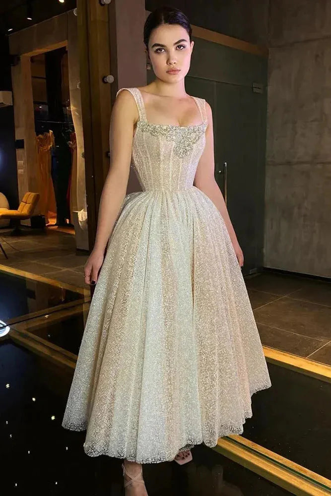 A-Linien-Glitzer-ärmellose hellchampagnerfarbene Brautkleider