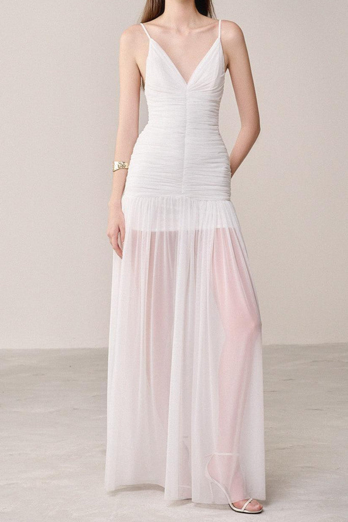 Belen Maxikleid aus Organza mit tiefer Taille und Spaghettiträgern in Weiß