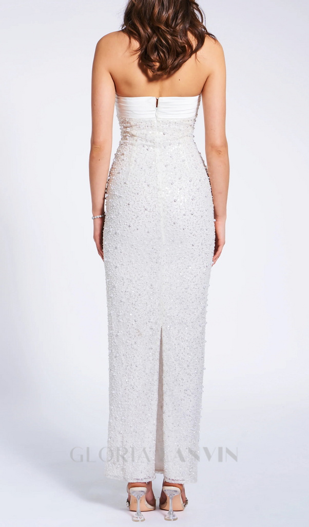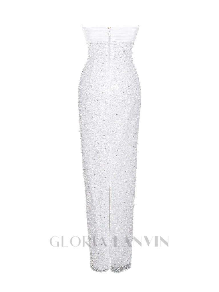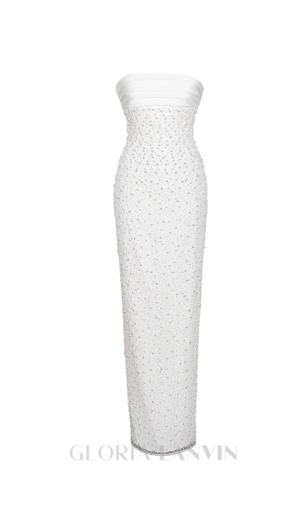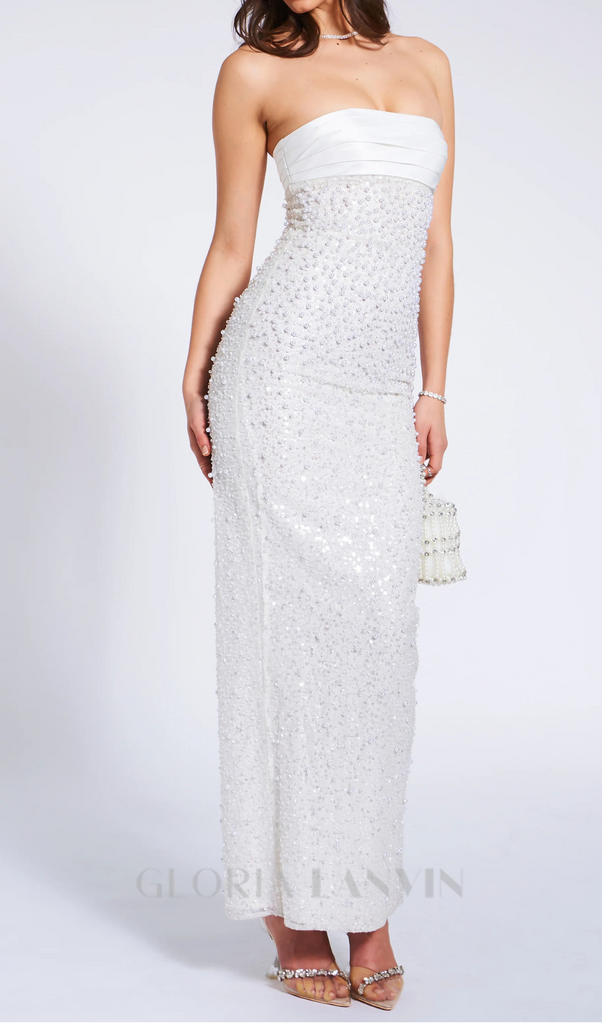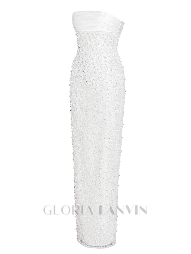 Weißes Satin-Maxikleid mit Pailletten, Perlen und Perlen – Gloria Lanvin