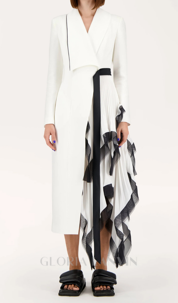 Asymmetrisches, plissiertes Blazer-Kleid mit Rüschenbesatz in Weiß
