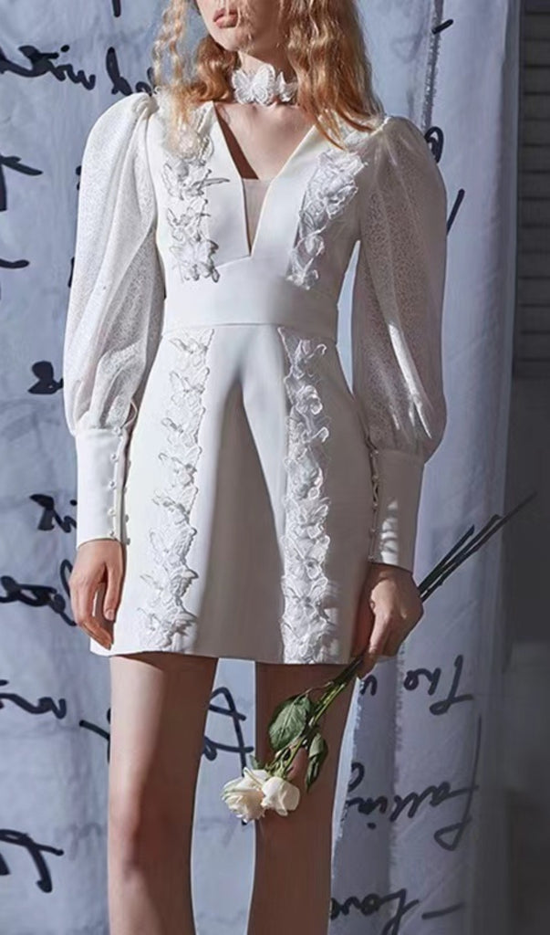 WEISSES MINIKLEID MIT LANGEN ÄRMELN UND V-AUSSCHNITT AUS SPITZE
