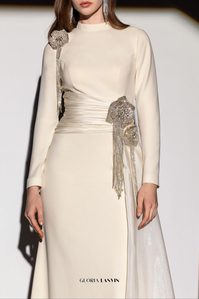Elevate your evening wardrobe with this sophisticated maxi dress, featuring delicate lace detailing and graceful pleated construction. The long sleeves provide refined coverage while the flowing silhouette creates an elegant, elongated line. Crafted in a warm apricot tone, this piece transitions seamlessly from formal events to upscale occasions. The intricate crystal flower embellishments add a touch of understated luxury, making it an investment piece that commands attention through timeless design rather than bold statements. Perfect for those who appreciate quality craftsmanship and understated glamour.