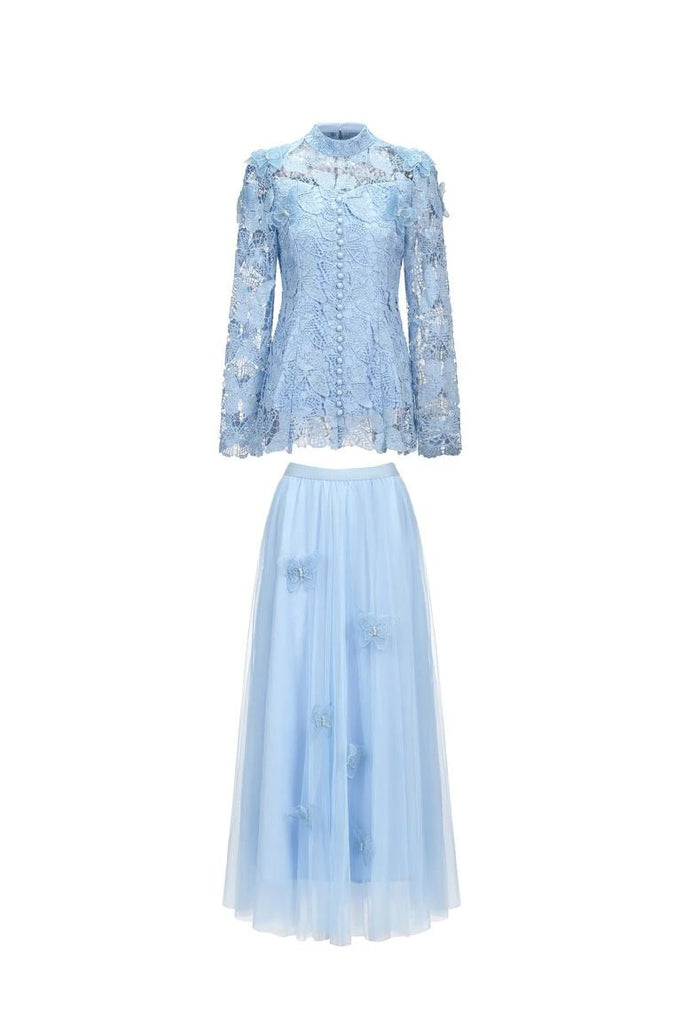 Mock Neck, Butterfly Detail, Single-breasted Buttons Decorated, Lace Panelling, Semi-sheer, Maxi Length.
