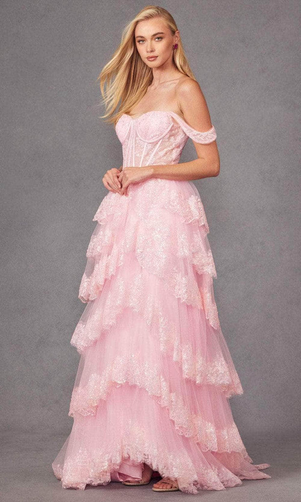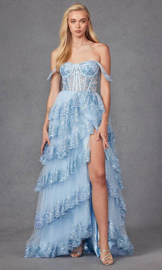 Get ready to embrace your inner elegance and beauty when you wear this Juliet Dresses masterpiece. Every detail of this gown exudes charm as it adorned in shimmering sequins, lace appliques, and embroidery. It boasts a sheer corset boning bodice with exposed boning, a sweetheart neckline and draped off-shoulder sleeves. The captivating open back is carefully closes by the adjustable lace-up tie and zipper. A ruffled tier design and scalloped in the A-line skirt create a truly magical effect. It finishes in a ravishing thigh-high leg slit and sweeping train. Fall in love when you slip on this Juliet Dresses JT2467K. Models are wearing Ice Pink, Light Blue, and Lilac colors.