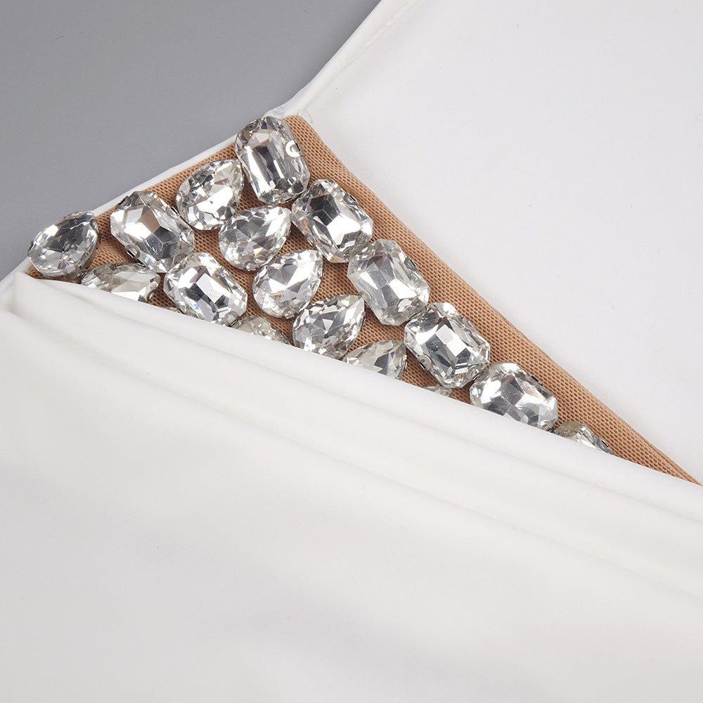 Verleihen Sie Ihrer Abendgarderobe mit dem weißen Neckholder-Maxikleid Sharon einen Hauch von Eleganz. Das raffinierte, rückenfreie Design und der gewagte hohe Schlitz machen dieses mit Diamanten besetzte Kleid zu einem echten Hingucker. Es unterstreicht Ihre Eleganz und Anmut, bietet eine makellose Passform, die Ihre Silhouette perfekt in Szene setzt und Ihnen gleichzeitig anmutige Bewegungsfreiheit ermöglicht. Ideal für festliche Anlässe: Der elegante Neckholder-Ausschnitt und die raffinierten Details setzen ein starkes Statement von raffiniertem Glamour.