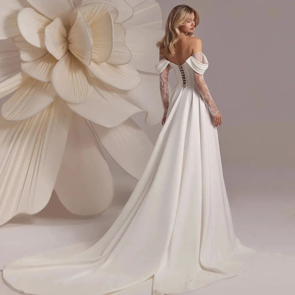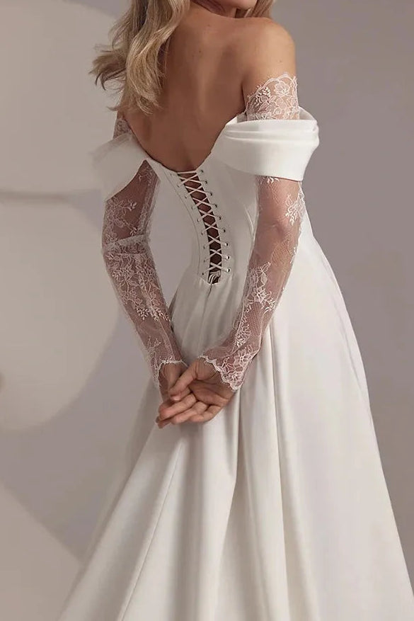 Brautkleider in A-Linie mit schulterfreiem Schnitt, Satin und Spitzenapplikationen