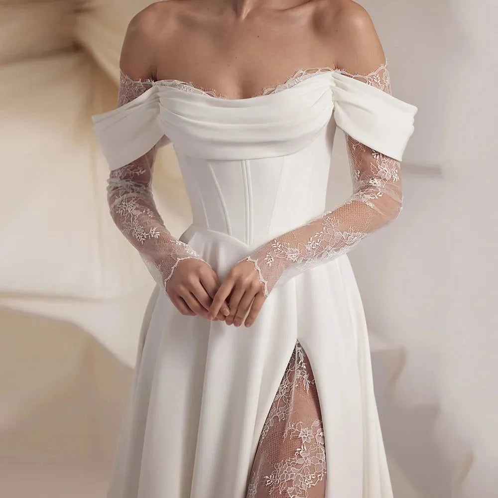 Dieses elegante Brautkleid in A-Linie mit schulterfreiem Ausschnitt vereint klassischen Charme mit moderner Raffinesse. Gefertigt aus glattem Satin, besticht es durch zarte Spitzenapplikationen. Ein stilvoller Schlitz vorne verleiht dem Kleid Schwung und Anmut – perfekt für Bräute, die sich an ihrem Hochzeitstag sowohl Tradition als auch modernes Flair wünschen.