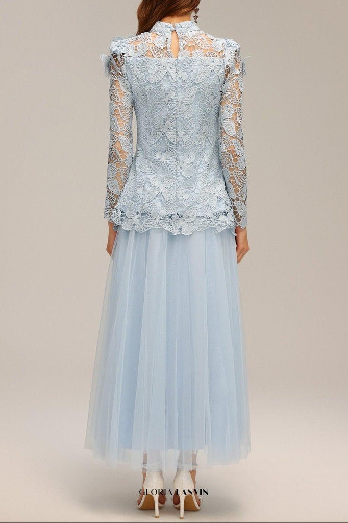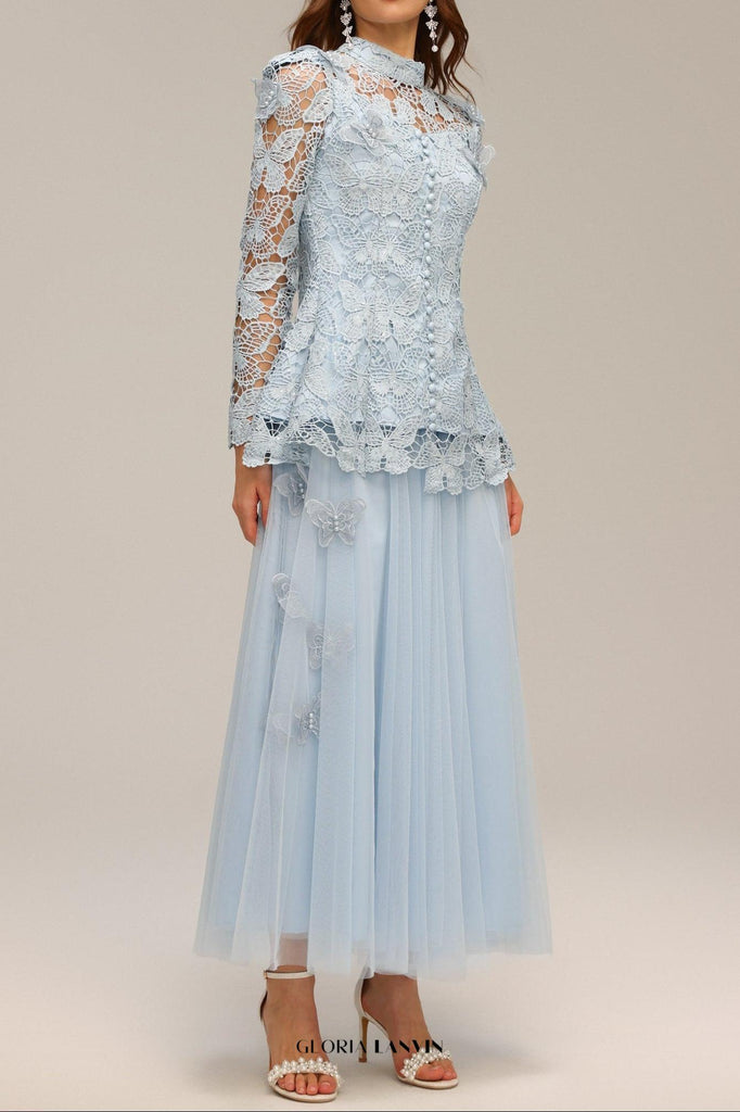 Elevate your wardrobe with this enchanting two-piece set featuring a graceful long-sleeve top adorned with delicate lace butterfly details and elegant folds. The coordinating skirt completes the look with matching lace accents, creating a cohesive and sophisticated ensemble. Perfect for special occasions or when you want to feel confident and beautiful, this set combines romantic design elements with flattering silhouettes. The thoughtful construction ensures comfort while you make a memorable impression. Embrace your unique style with this charming collection that celebrates femininity and grace.