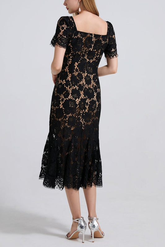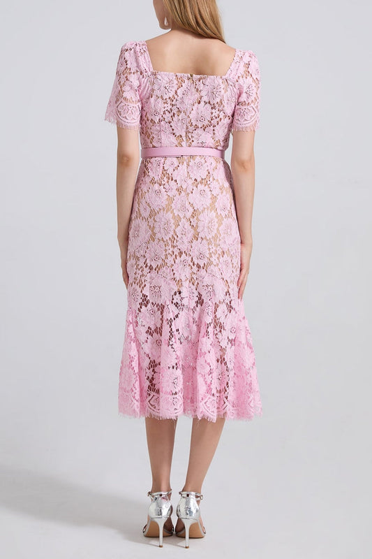 ROBE MIDI EN DENTELLE ROSE À COL CARRÉ