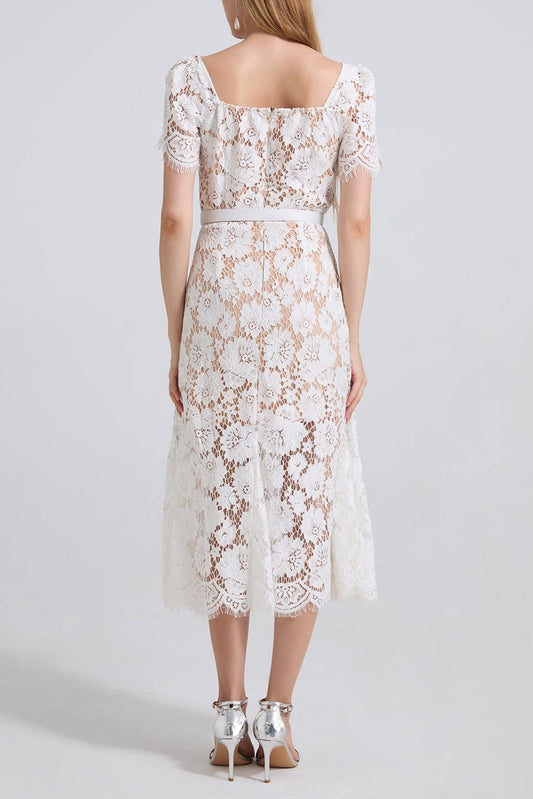 Robe midi blanche à bretelles et empiècements en dentelle satinée