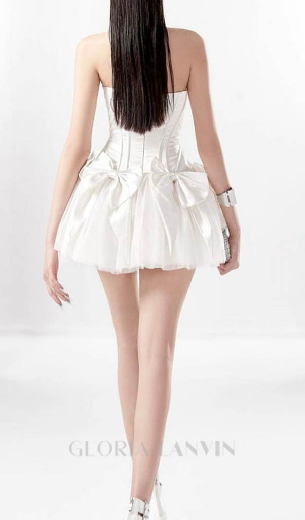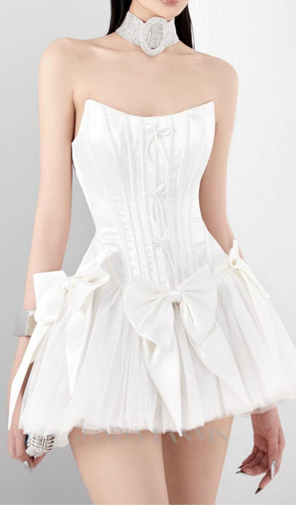 Le délicat nœud papillon apporte une touche de sophistication à cette robe bustier, tandis que le tissu en résille lui confère une subtile note de séduction. Parfaite pour toute occasion spéciale, cette robe vous assurera une allure luxueuse et exclusive.