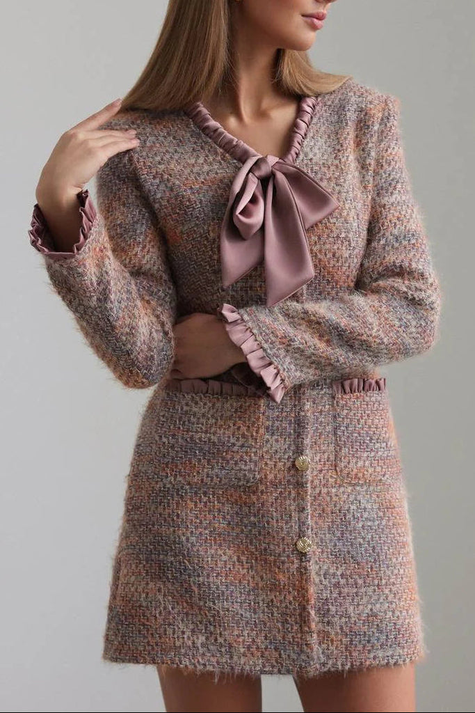 Robe mini Xylia à manches longues et col en V, ornée d'un nœud multicolore