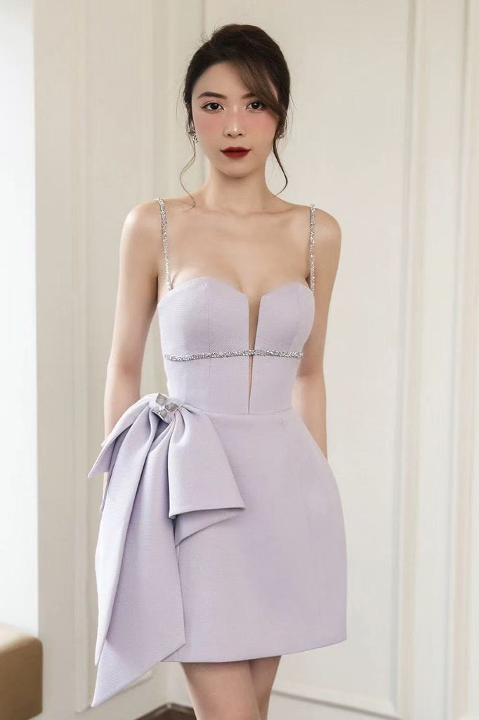 Robe mini bouffante en satin violet à nœud papillon Cara