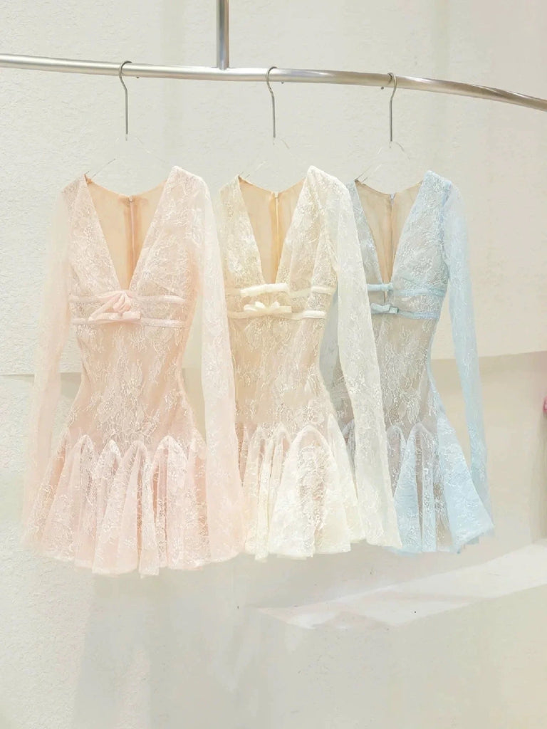 Robe courte Eileen rose à manches longues, col en V et coupe trapèze en dentelle
