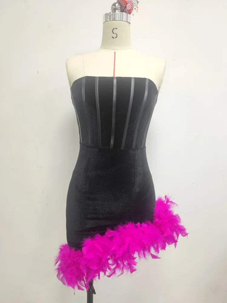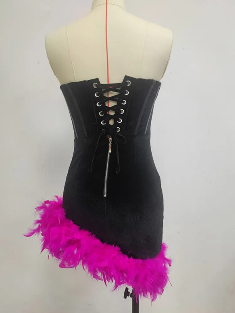 Cette robe présente un corsage sensuel de style corset avec des détails à lacets, conçu pour cintrer votre taille et créer une silhouette en sablier. La jupe en plumes ludique ajoute une touche de glamour et d'espièglerie, tandis que la longueur mini met en valeur vos jambes pour un look sexy et confiant.